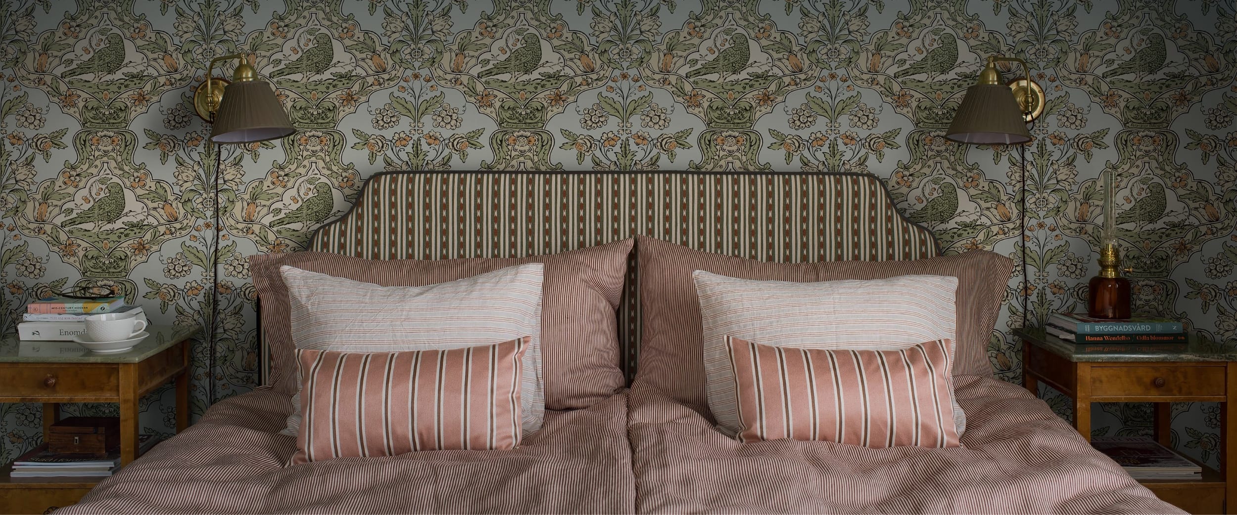 Cette collection de papiers peints historiques offre un éventail unique de papiers peints d’époque, allant des somptueux cuirs dorés baroques et des motifs au pochoir de la tradition populaire aux douces palettes du rococo et aux compositions florales délicates de l’Art nouveau. Vous y trouverez également une réimpression du plus ancien papier peint en papier produit en Suède !