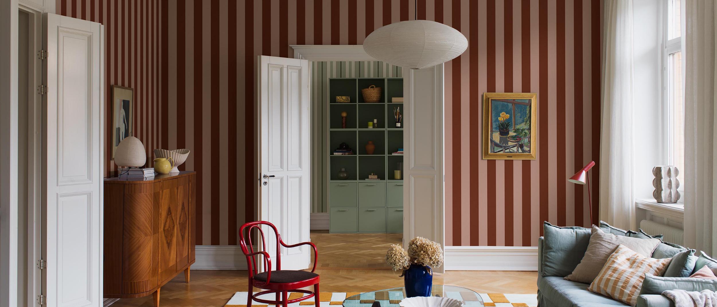 Intemporels, les papiers peints panoramiques à rayures grand format créent une belle dynamique dans la pièce.